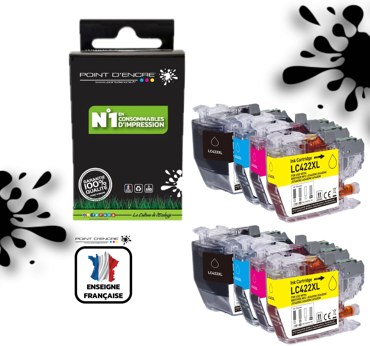 LC422XL - 2 X Pack de 4 Cartouches D'encre Noir/Cyan/Magenta/ Jaune - Grande capacité de Marque Française POINT D'ENCRE Pour imprimante compatible BROTHER (ceb)